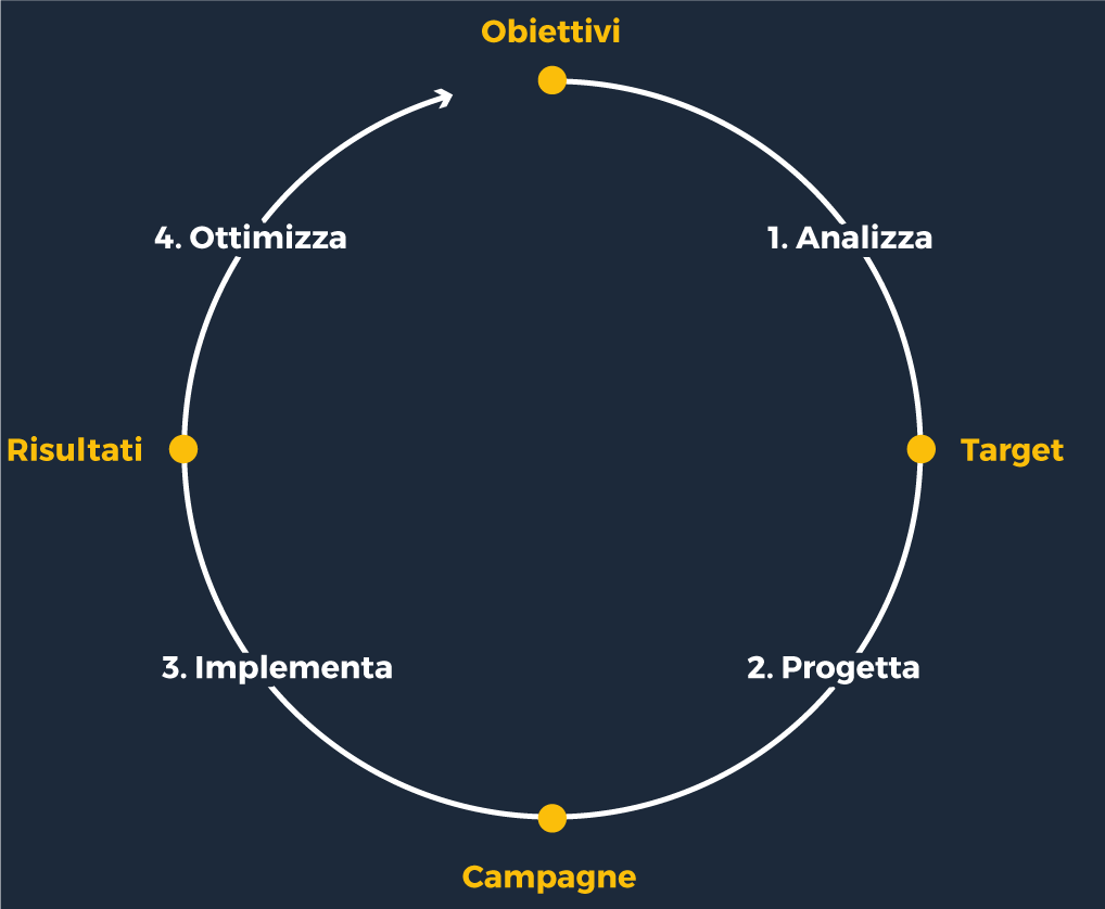 Sulla base dei risultati e degli analytics ottimizziamo gli obiettivi di marketing, la struttura delle campagne ed i contenuti utilizzati.